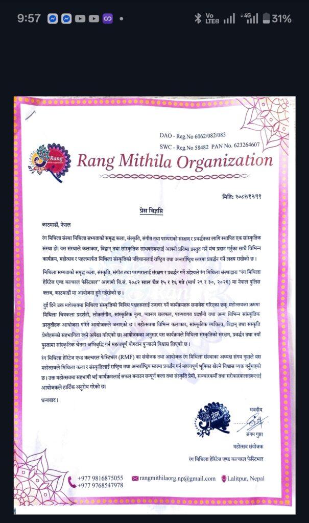 ललितपुर — मिथिला कला र संस्कृतिको संरक्षण तथा प्रवर्द्धन गर्ने उद्देश्यले रंग मिथिला हेरिटेज एण्ड फेस्टिवल (RMF) आयोजना गरिने भएको छ। विभिन्न कलाकार, सांस्कृतिक व्यक्तित्व, विद्वान तथा संस्कृतिप्रेमीहरूको सहभागितामा हुने यस महोत्सवले मिथिला संस्कृतिलाई राष्ट्रिय तथा अन्तर्राष्ट्रिय स्तरमा प्रवर्द्धन गर्ने अपेक्षा गरिएको छ।