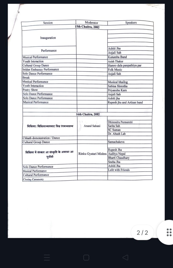 दोस्रो दिन (चैत्र १६) “मिथिला: मिथिलाञ्चलबाट विश्व समुदायसम्म” विषयमा अन्तरक्रिया कार्यक्रम सञ्चालन हुनेछ, जसमा आनन्द साहनीको संयोजनमा धिरेन्द्र परमेश्री, सरिता साह, एससी सुमन र डा. अबश ल्याब लगायतका वक्ताहरूले धारणा राख्नेछन्। त्यसैगरी “मिथिलामा संस्कार र संस्कृतिको अवस्था र चुनौती” विषयमा छलफल कार्यक्रम पनि आयोजना गरिनेछ।