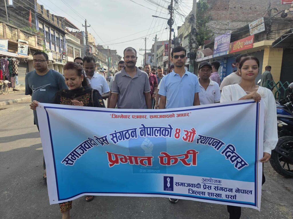 वीरगंज १० भदौ । समाजवादी प्रेस संगठन नेपाल पर्साले वीरगंजमा प्रभातफेरी निकालेको छ । संगठनको चौथो स्थापना दिवसको अवसरमा वीरगंजको घण्टाघरबाट शुरु भएको प्रभातफेरी माईस्थान, महाविरस्थान, आदर्शनगर घडिअर्वा हुँदै नगर परिक्रमा गरेर पुनः घण्टाघरमा पुगी कोणसभामा परिणत भएको थियो ।